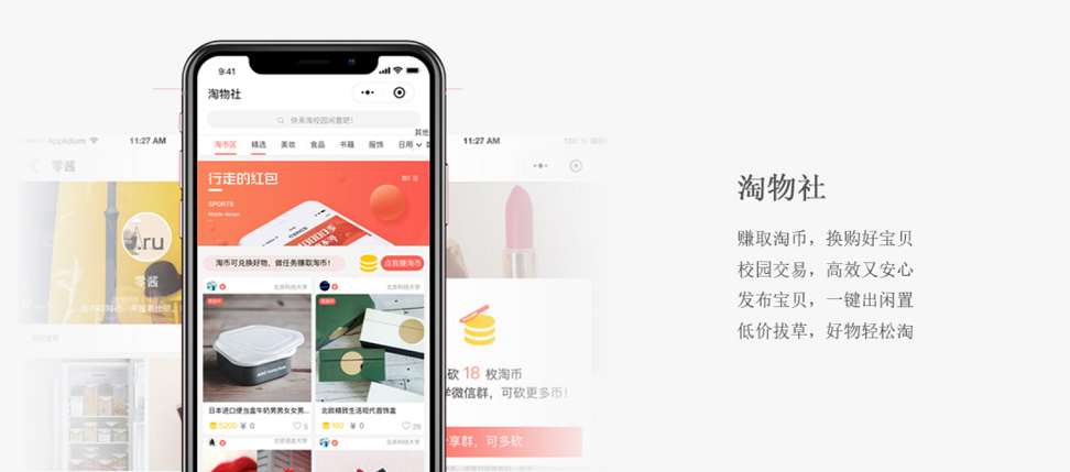 “淘物社”是一款由北大、北科創(chuàng)業(yè)團(tuán)隊(duì)共同創(chuàng)辦,由北京合合科技承接開(kāi)發(fā)的校園二手交易小程序,團(tuán)隊(duì)成員來(lái)自清華、北大、科大、滴滴、京東等高校及名企。該創(chuàng)業(yè)項(xiàng)目現(xiàn)已獲得個(gè)人種子輪投資,總用戶數(shù)千,日活數(shù)百,并已獲得北京大學(xué)全球創(chuàng)新創(chuàng)業(yè)中心加速孵化資格和北科大“種子計(jì)劃”優(yōu)秀項(xiàng)目。