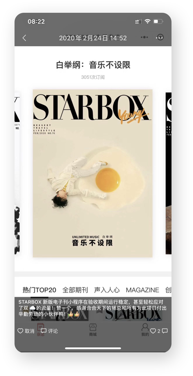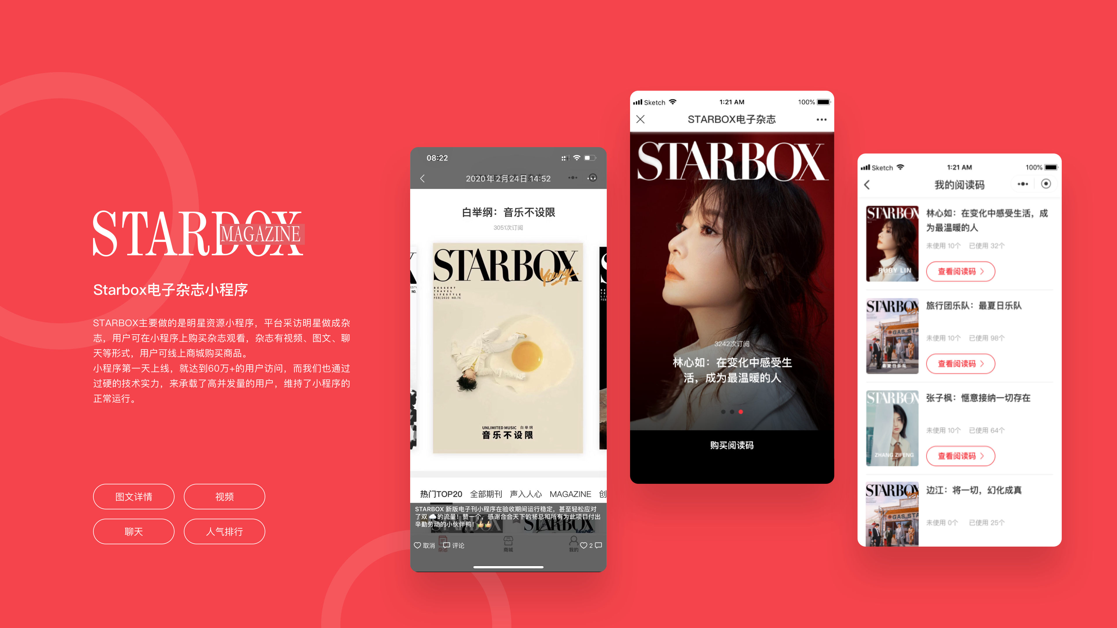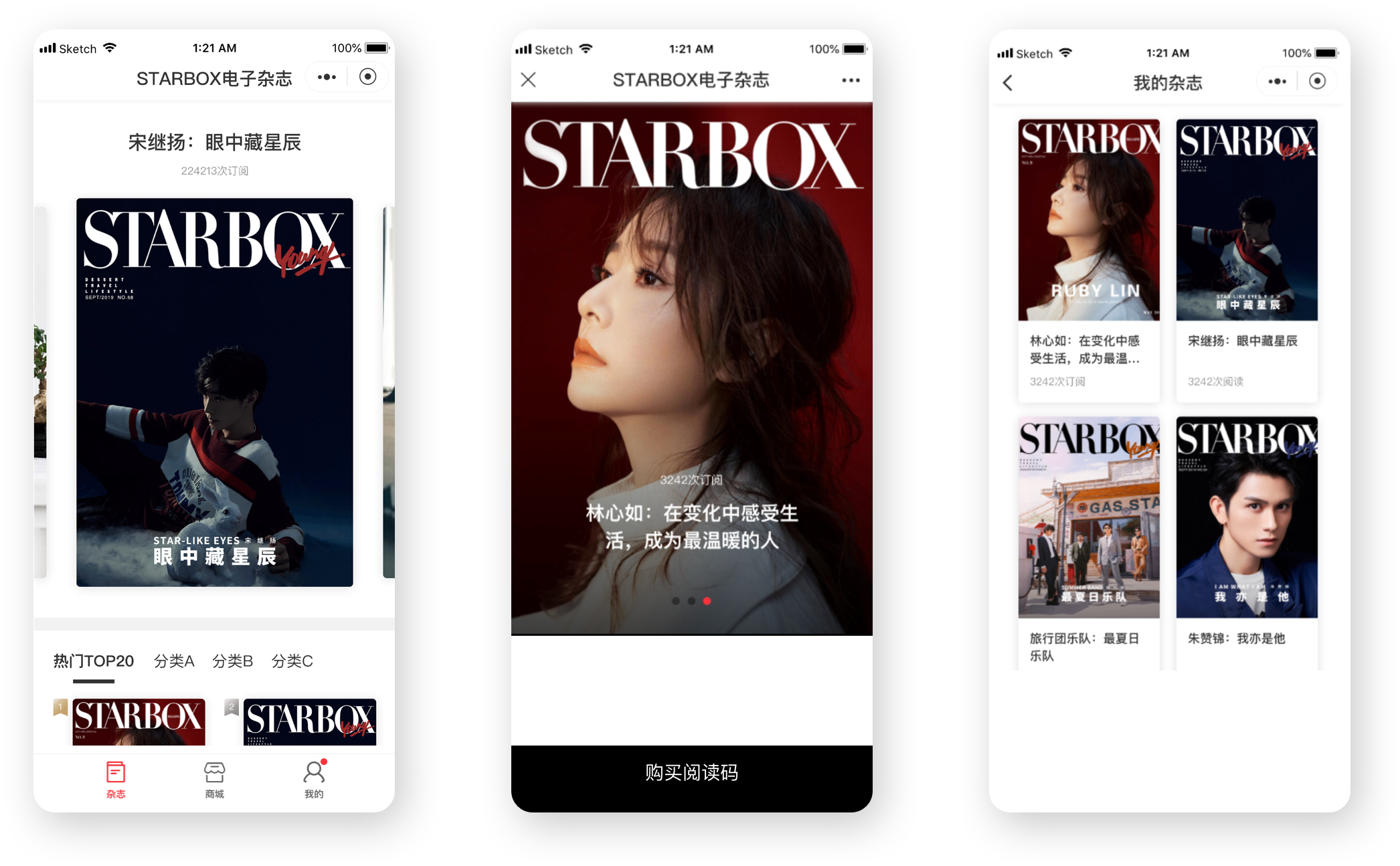 《STARBOX電子雜志》是一款微信小程序,《STARBOX》電子刊是本聚焦年輕偶像以及獨(dú)特個(gè)性的意見(jiàn)領(lǐng)袖,分享他們生活方式的潮流特刊。 讀者通過(guò)微信小程序可直接挑選所喜歡的雜志,購(gòu)買相應(yīng)閱讀碼,通過(guò)輸入閱讀碼閱讀雜志。同時(shí)用戶可以預(yù)覽雜志,可以查看已購(gòu)買的雜志和閱讀碼。 雜志內(nèi)容包括圖文詳情、視頻、人氣排行等等。