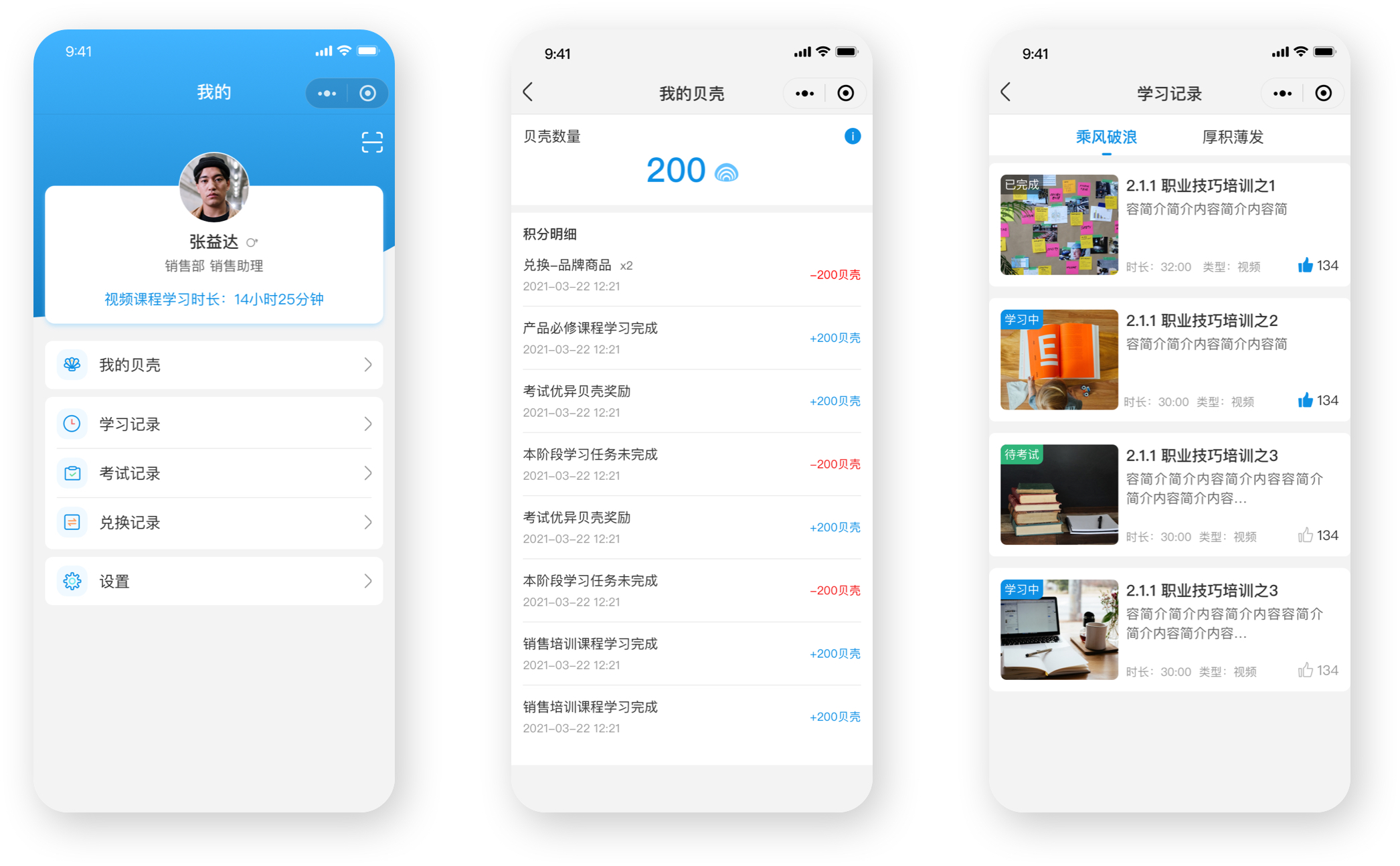 我的模塊包括我的貝殼、學(xué)習(xí)記錄、考試記錄、兌換記錄等。