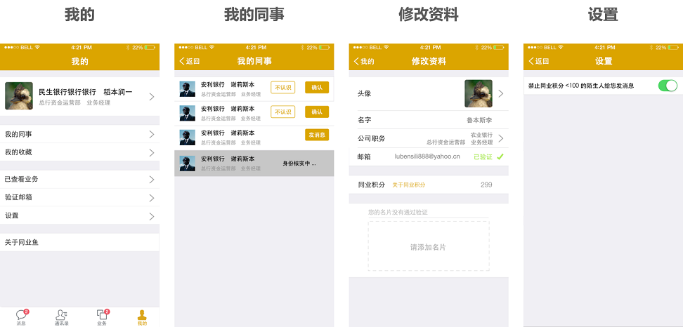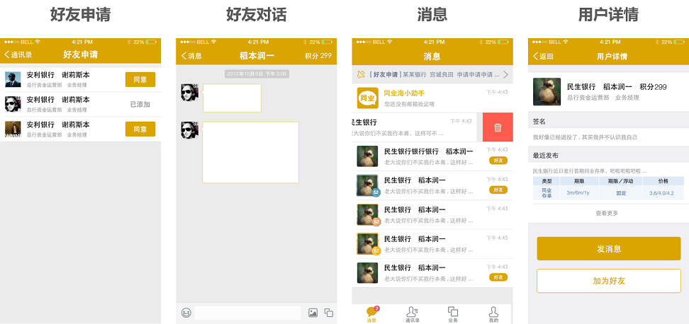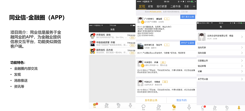 同業(yè)信是服務(wù)于金融同業(yè)的APP,為金融業(yè)提供信息交互平臺(tái),功能類(lèi)似微信客戶(hù)端。主要特色功能包括金融圈內(nèi)部交流、發(fā)現(xiàn)、消息推送、資訊、二級(jí)市場(chǎng)等。