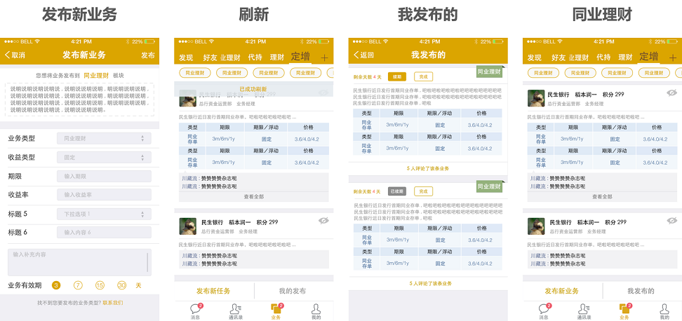 專(zhuān)注金融同業(yè)的業(yè)務(wù)交流,業(yè)務(wù)模板化發(fā)布系統(tǒng),一鍵分享微信。計(jì)算每個(gè)用戶(hù)的同業(yè)值,智能排序業(yè)務(wù)。
