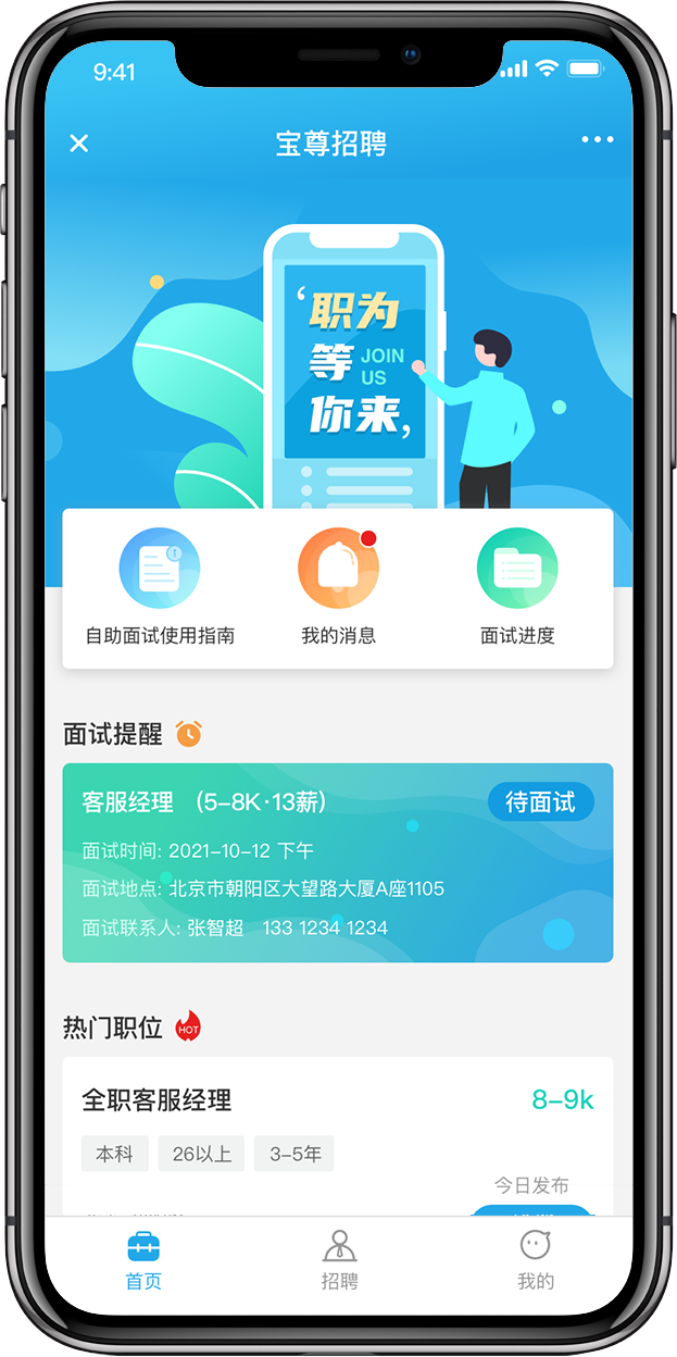 最上面為整體展示的輪播圖,下面主要包括自助面試使用指南,我的消息、面試進度;中間是面試提醒,如果有待面試信息,就會展示在這里,再下面是招聘崗位的展示。對于應(yīng)聘人員可以打開查看崗位,選擇一鍵投遞。