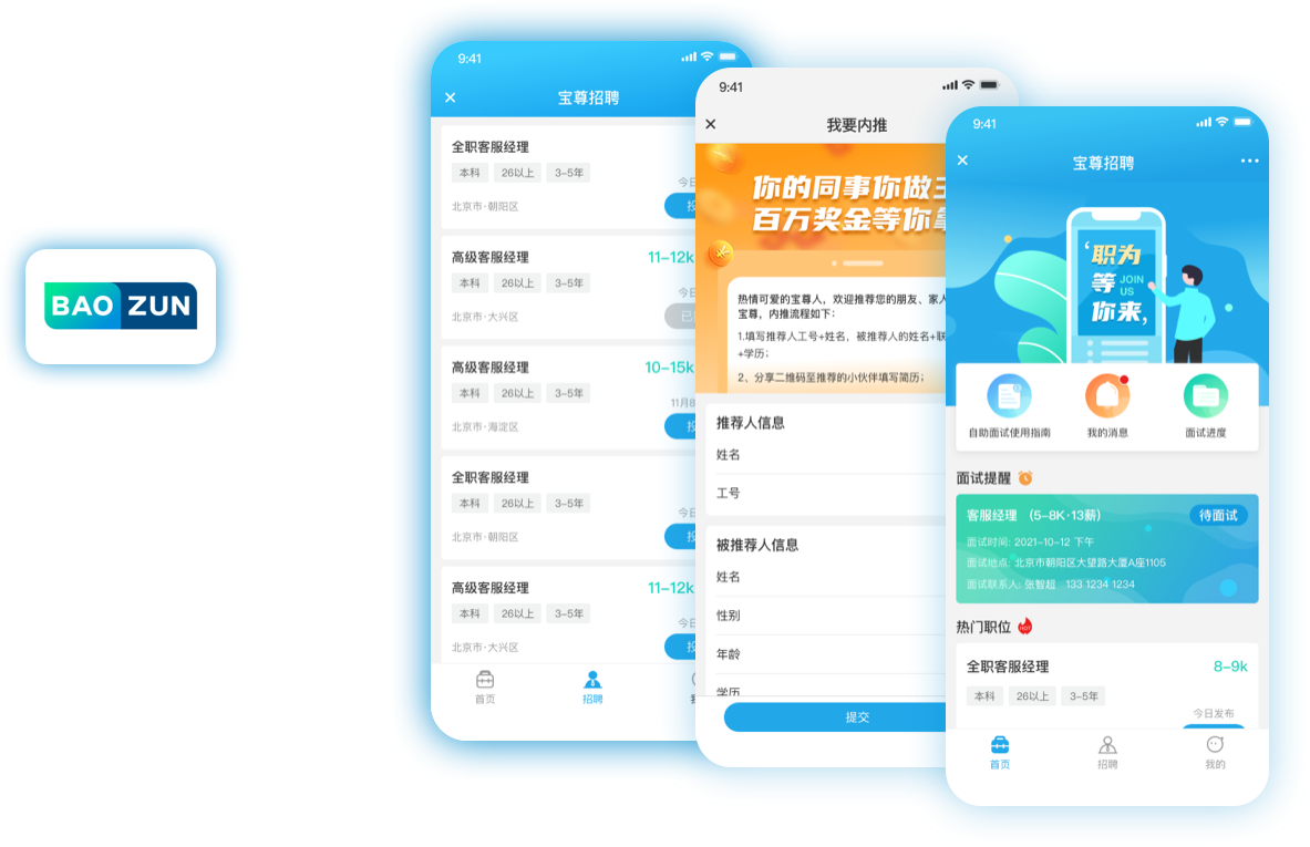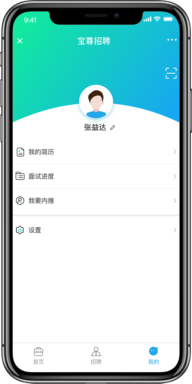 主要是登錄寶尊公眾號后,進入招聘功能的用戶,我的部分主要是展示我的簡歷、面試進度、我要內(nèi)推和設(shè)置功能。