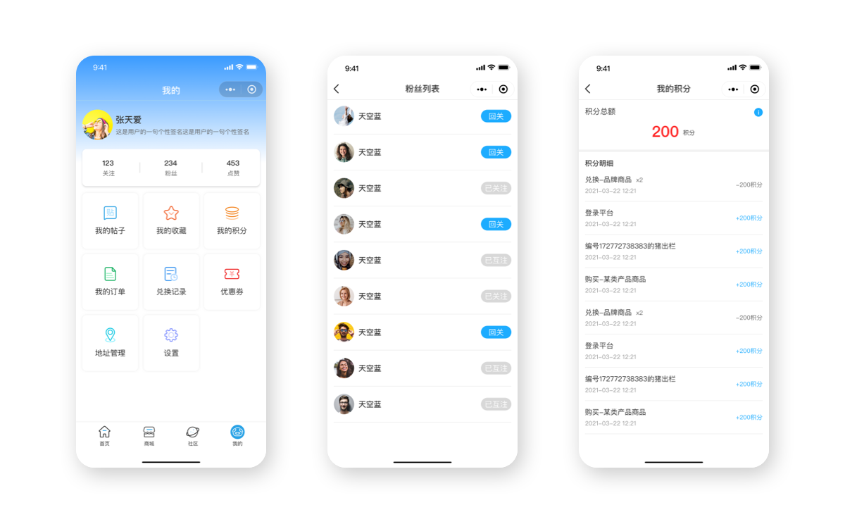 包括我的關(guān)注、粉絲、點(diǎn)贊等,我的貼子、收藏、積分、訂單、優(yōu)惠券、地址管理、設(shè)置等。