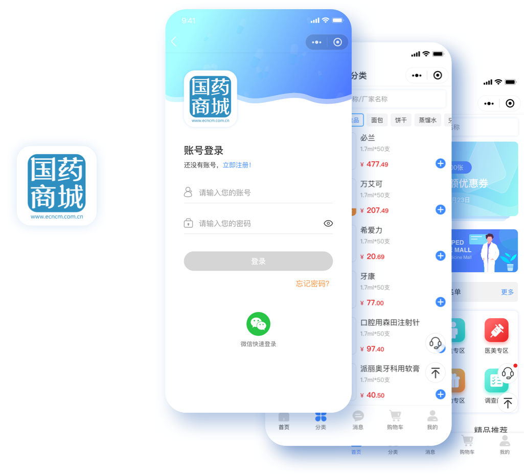 國藥商城小程序開發(fā)包括兩部分內(nèi)容:小程序用戶端功能界面和小程序服務(wù)端接口。國藥商城小程序用戶端主體包括“首頁、分類、消息、購物車、我的”五部分