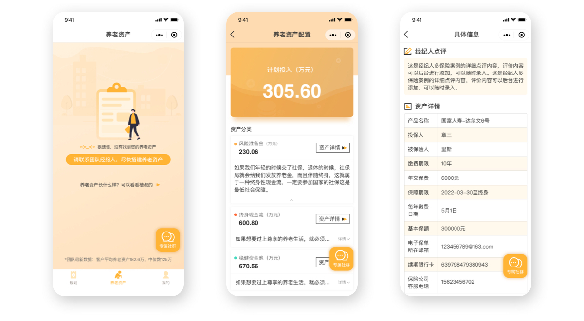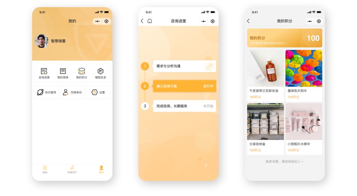 包括咨詢進(jìn)度、我的保單、我的積分、理賠實(shí)錄、養(yǎng)老社群、設(shè)置等。