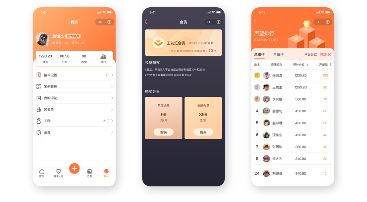 我的頁面展示包括我的信用分、評分等;成為師傅(可以申請成為裝修師傅)、我的評論、我的案例、我的接單設(shè)置、黑名單、設(shè)置等。