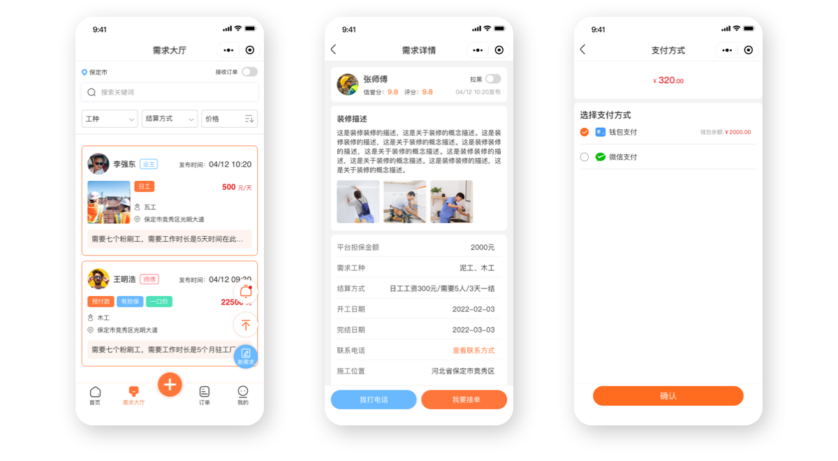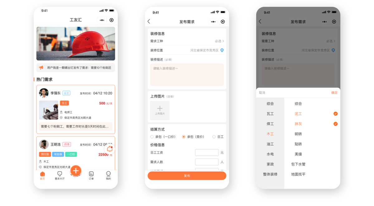 需求大廳頁面展示包括選擇城市、搜索框、可以按照所需要的工種類別(木工、瓦工、油工……)、結(jié)算方式、價(jià)格等進(jìn)行篩選。