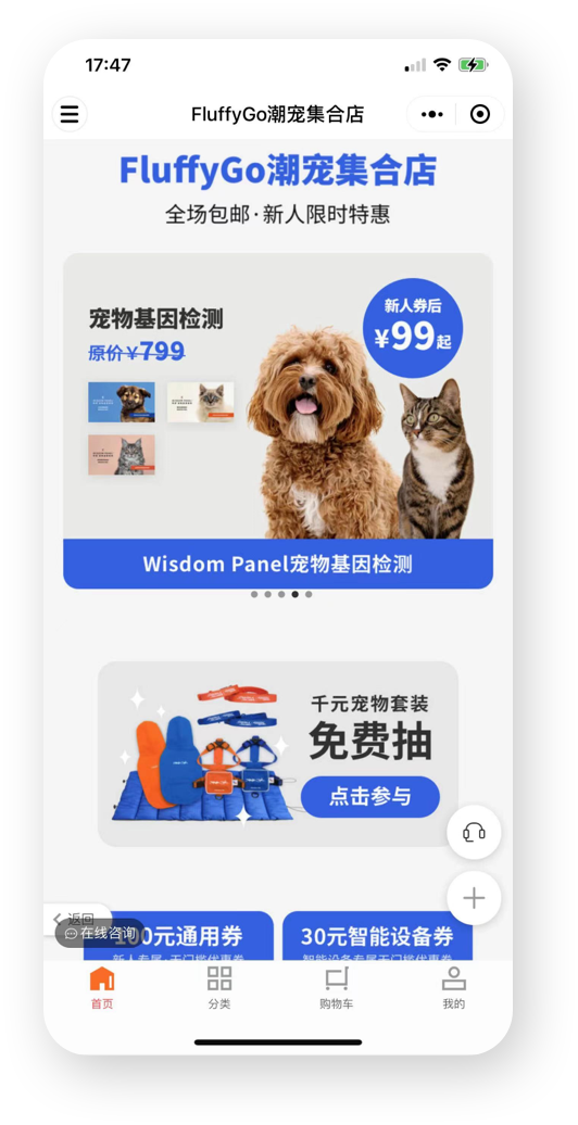 毛球總動(dòng)員商城頁(yè)面可以跳轉(zhuǎn)進(jìn)入寵物商城頁(yè)面,包括商品分類,主要有狗狗精選、貓咪精選、潮人精選等,包括加入購(gòu)物車、我的頁(yè)面等。