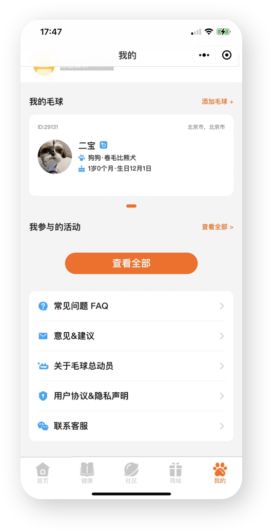 毛球總動(dòng)員社區(qū)我的頁(yè)面呈現(xiàn)的主要是寵物個(gè)人信息(類別、年齡、生日等)、我參與的活動(dòng)以及問(wèn)題、客服、關(guān)于、用戶協(xié)議等常規(guī)模塊。