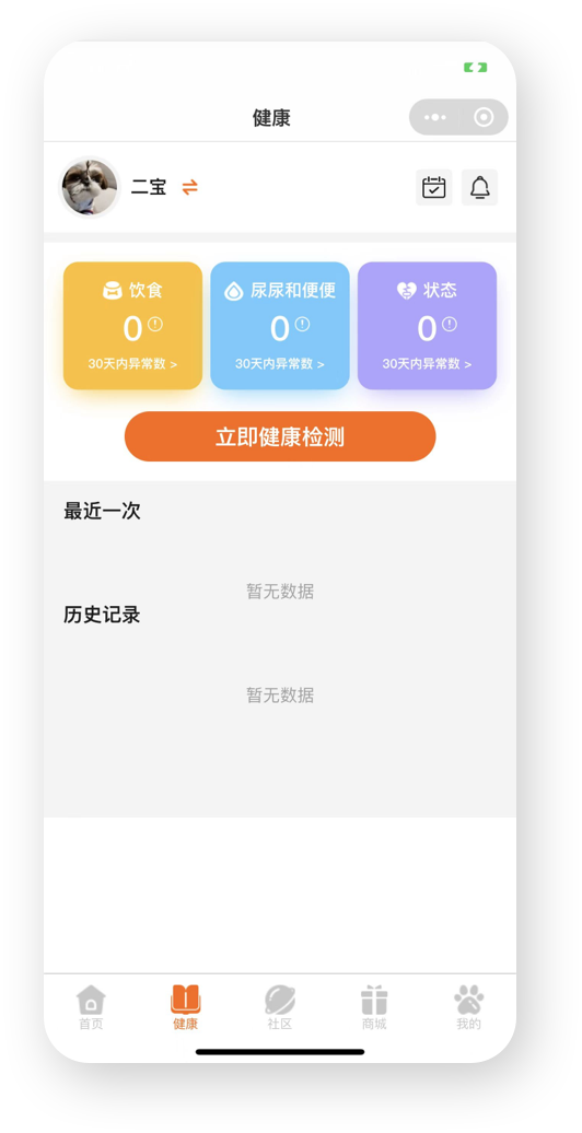 毛球總動(dòng)員健康頁(yè)面呈現(xiàn)的有飲食模塊、尿尿便便模塊、狀態(tài)模塊、以及健康檢測(cè)歷史記錄。