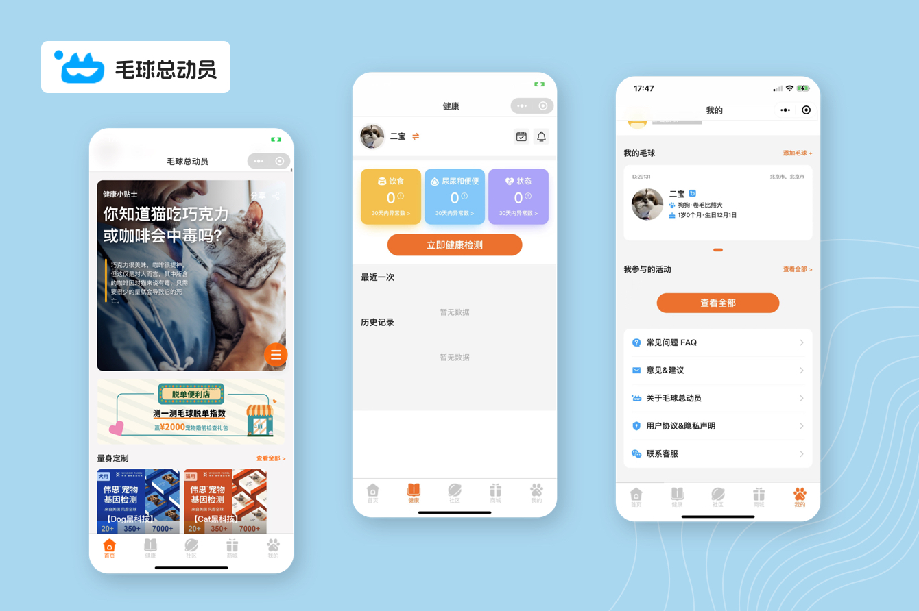 毛球總動(dòng)員首頁(yè)呈現(xiàn)的有輪播圖、脫單便利店、量身定制的寵物基因檢測(cè)、寵物護(hù)理專業(yè)課程、寵物相關(guān)的熱門活動(dòng)等。