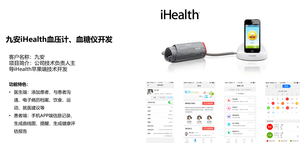 iHealth血壓計、血糖儀的開發(fā),主要是九安科技所增資參股的公司委托北京合合科技負責(zé),對iHealth產(chǎn)品手機端進行了開發(fā)。項目主要包括了醫(yī)生端和患者端兩端的內(nèi)容。