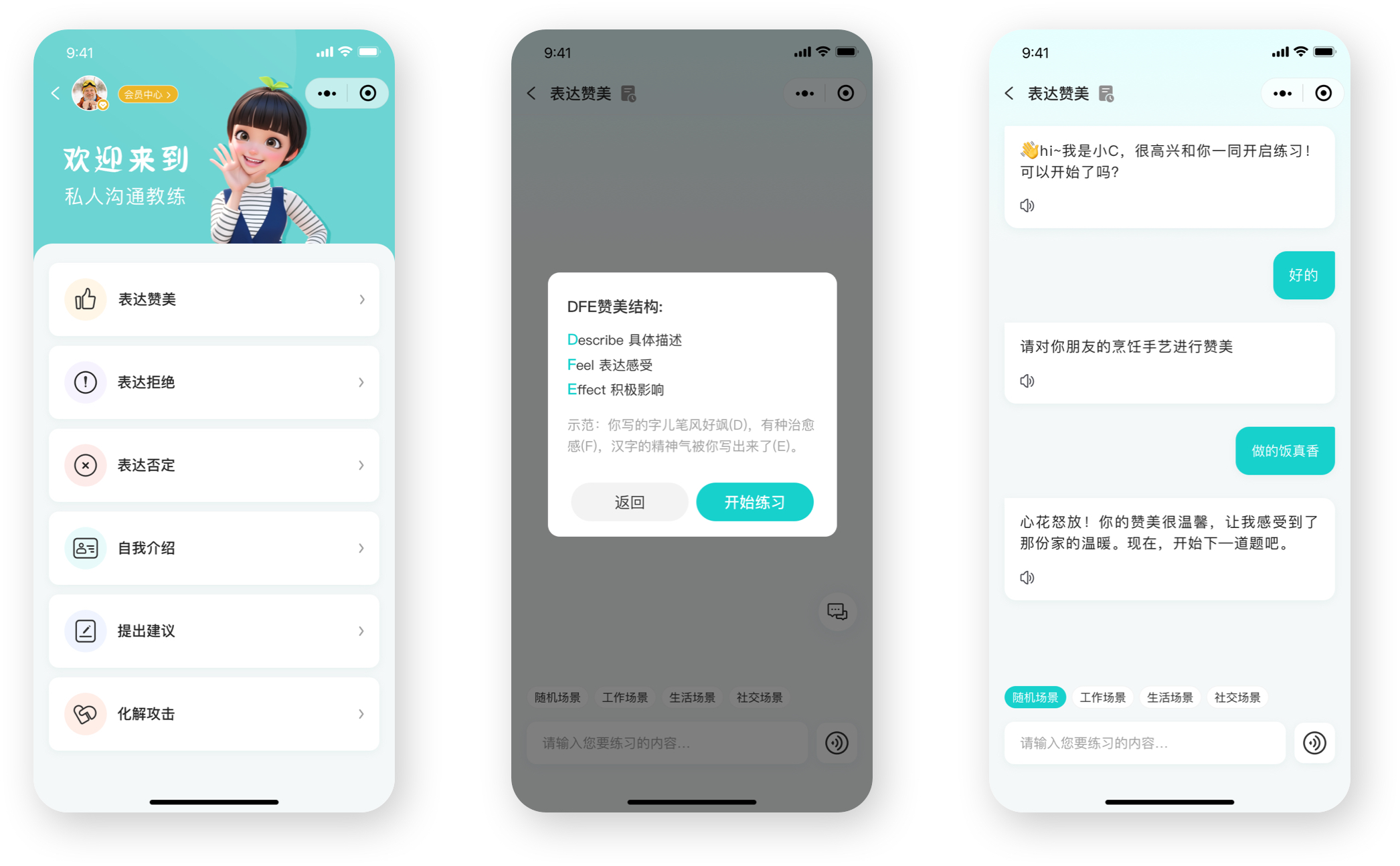 私人溝通教練模塊,可以幫助用戶提高溝通技巧,實現(xiàn)高情商溝通。包括學(xué)會表達(dá)贊美、表達(dá)拒絕、表達(dá)否定、進(jìn)行自我介紹、提出建議、化解攻擊等模塊。