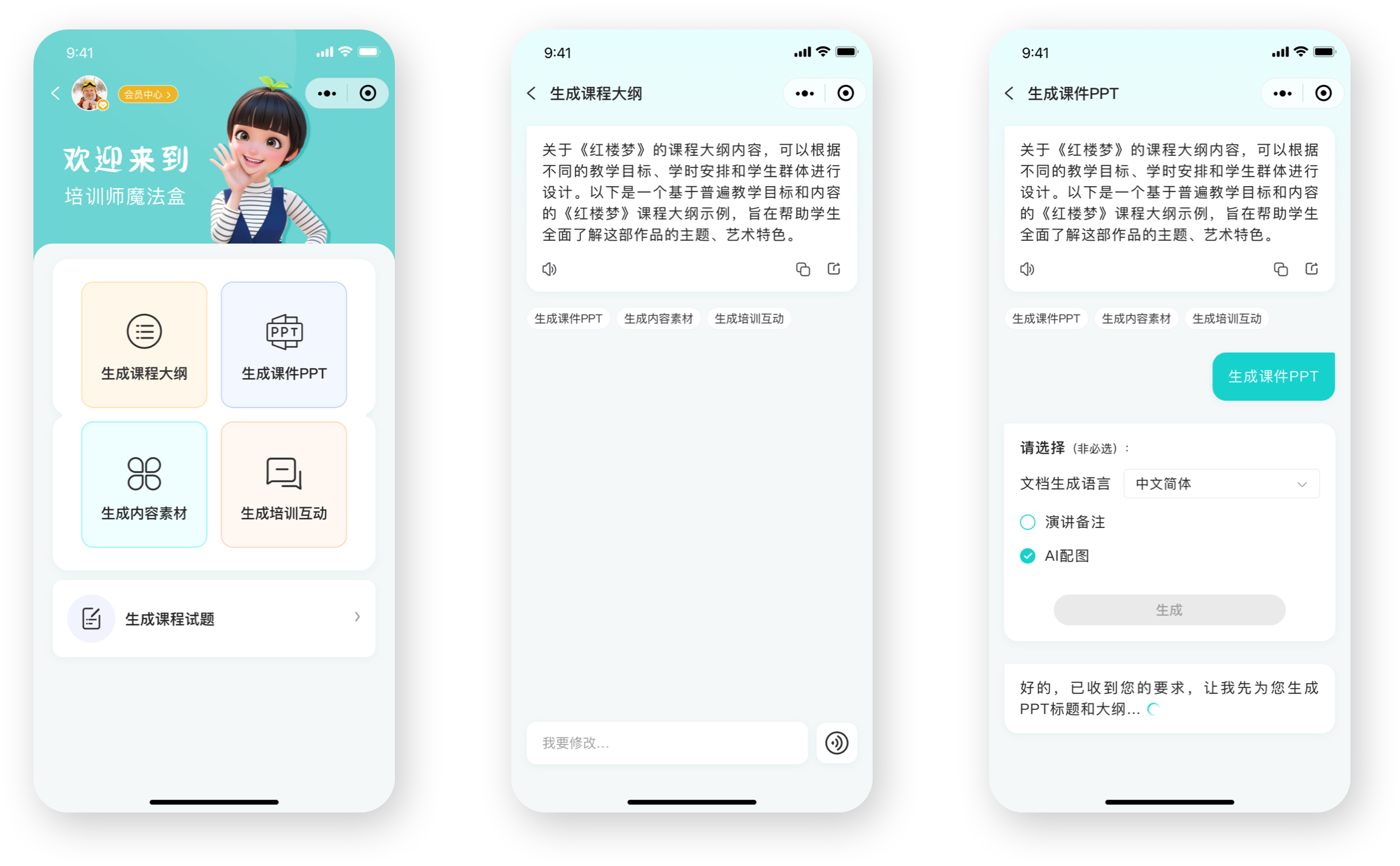 可以進(jìn)行培訓(xùn)信息完善,包括課程名稱、所屬行業(yè)、培訓(xùn)企業(yè)、學(xué)院崗位、培訓(xùn)時長、重點解決的問題等,可以幫助用戶生成課程大綱、生成課件PPT、生成內(nèi)容素材、生成培訓(xùn)培訓(xùn)互動等,還可以生成課程的試題。