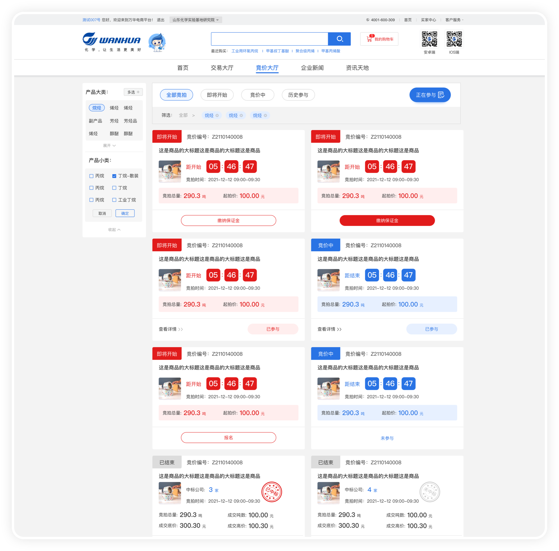 又分為全部競(jìng)拍產(chǎn)品、即將開(kāi)始競(jìng)拍產(chǎn)品、競(jìng)價(jià)中產(chǎn)品和歷史參與的競(jìng)拍產(chǎn)品。
