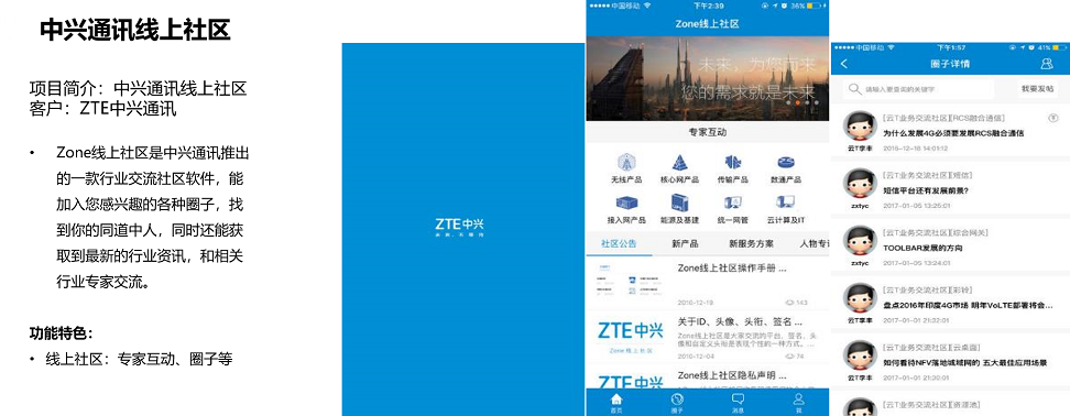 項(xiàng)目為中興通訊線上社區(qū),Zone線上社區(qū)是中興通訊推出的一款行業(yè)交流社區(qū)軟件,能加入您感興趣的各種圈子,找到你的同道中人,同時(shí)還能獲取到最新的行業(yè)資訊,和相關(guān)行業(yè)專家交流。