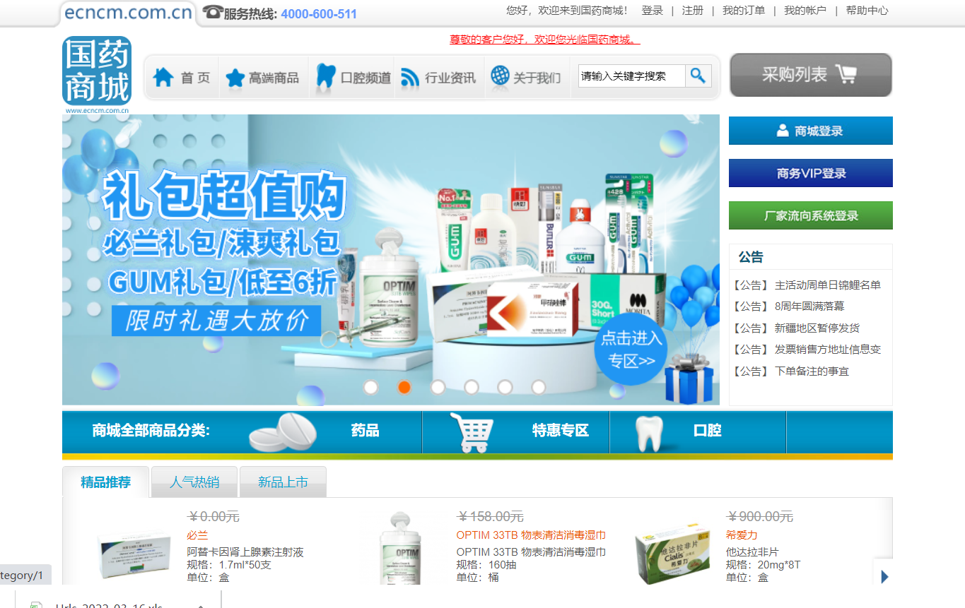 國藥商城PC端,原是國藥股份自主研發(fā)的,面向零售藥店、口腔診所、民營醫(yī)院等客戶群體的PC端B2B在線商城,是公司在創(chuàng)新服務(wù)模式上的探索。自2013年投入運(yùn)營原來,已經(jīng)積累上萬家客戶,年銷售額近1.4億元。